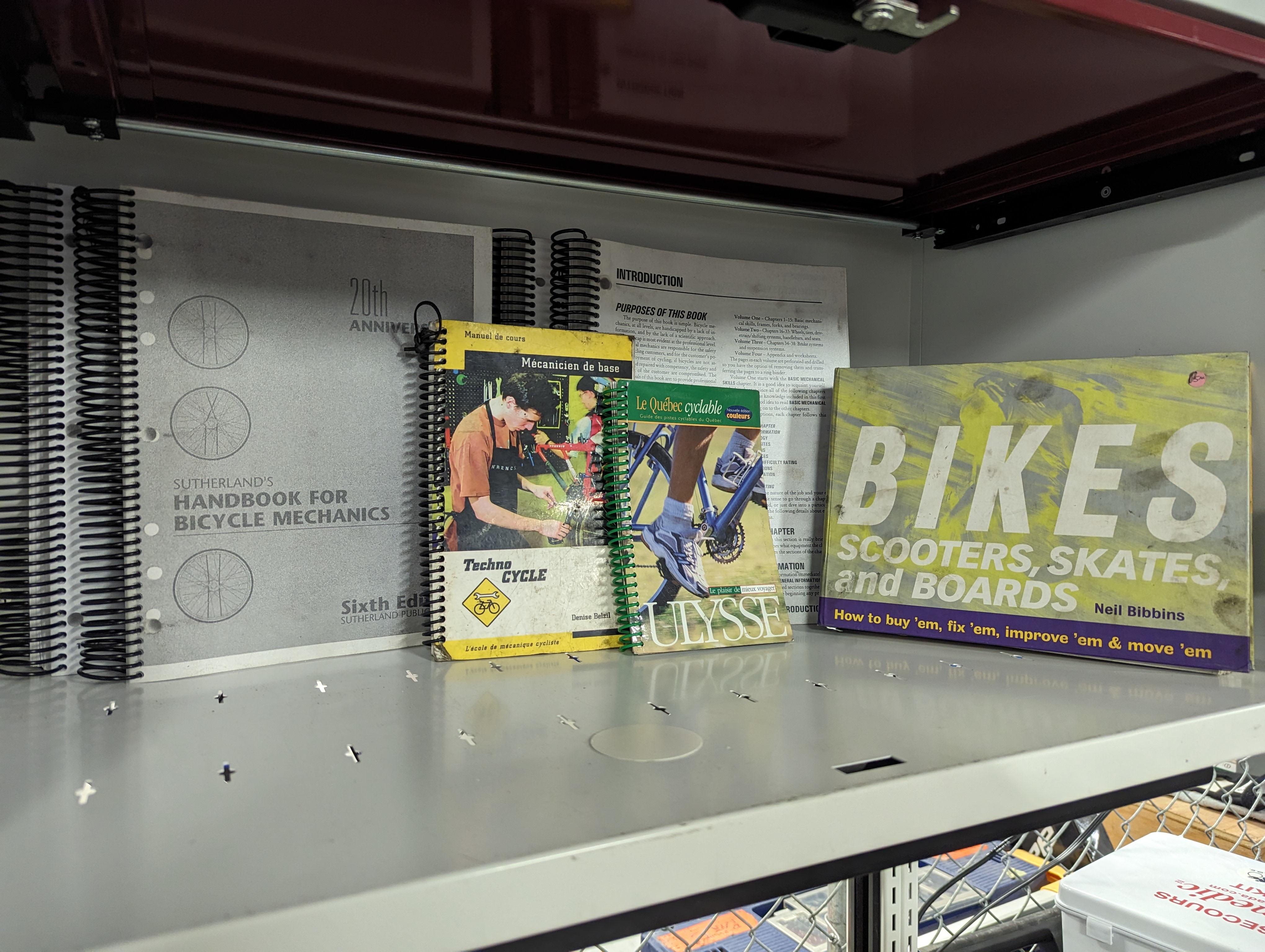 Le C.R.A.B.E. est certes un atelier, mais surtout un lieu d’apprentissage. Il y a à votre disposition des guides et manuels sur le vélo en tout genre.